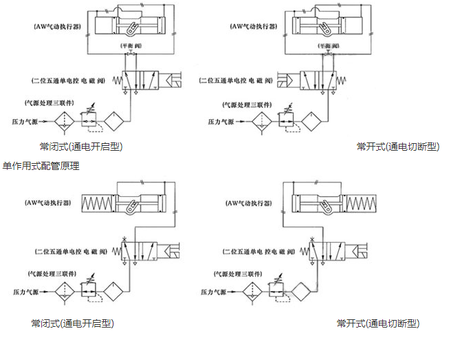 以上为标准型的传动原理。根据用户需求,AW气动执行器可装置成与标准型相反的传动原理,即选准轴顺时针方向转动为开启阀门,逆时针方向转动为关闭阀门。单作用(弹簧复位型)AW气动执行器A管咀为进气口,B管咀为排气孔(B管咀应安装消声器)。A管咀进气为开启阀门,断气时靠弹簧力关闭阀门。