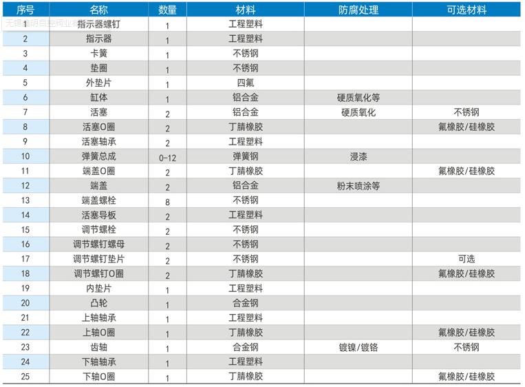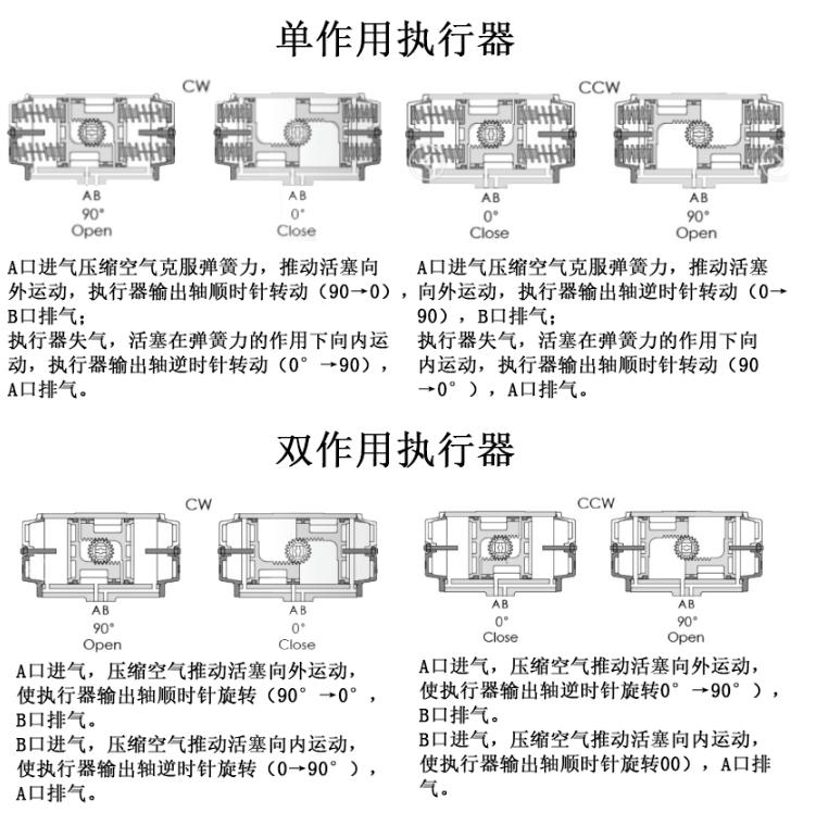 本公司生产的活塞式AT气动执行器主要由气缸、活塞、齿轮轴、端盖、密封件、螺丝等组成;其中还包括开度指示、行程限位、电磁阀、定位器、气动元件、手动机构、信号反馈等部件。具有使用寿命长,抗腐蚀性能强等特点。广泛运用于各行各业的自控领域之中。